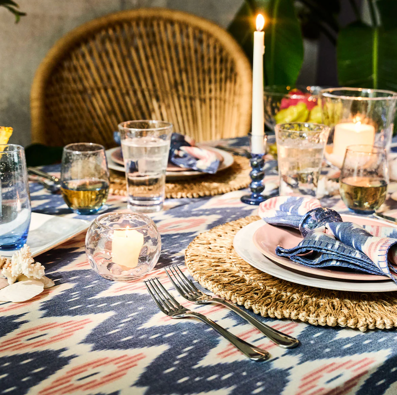 Inspired by our love of ancient loom-weaving traditions, the distinctive blurred pattern of traditional Ikat is awash in sun-faded blush tones and breezy blues and finished with a simple hand-stitched trim to evoke the easy elegance and relaxed charm of island living.