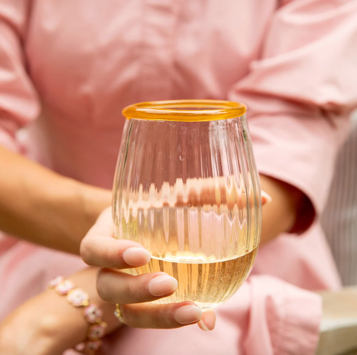 Our iconic Bohemian Glass is given a fresh and modern spin with a joyful wink of color. Chic and shimmering, each Double Old Fashioned ripples with intricate mouth blown glass and is rimmed with a happy hue to create pure cocktail-hour eye candy for everything from water to whisky. Pick a pop of your favorite color or collect them all to taste the rainbow!