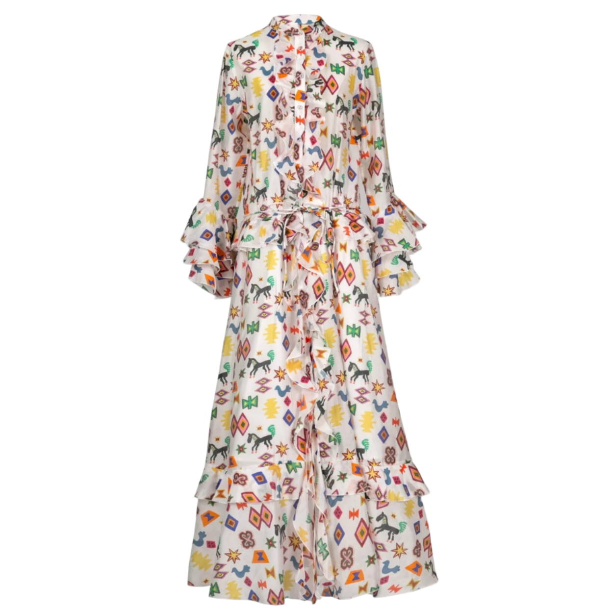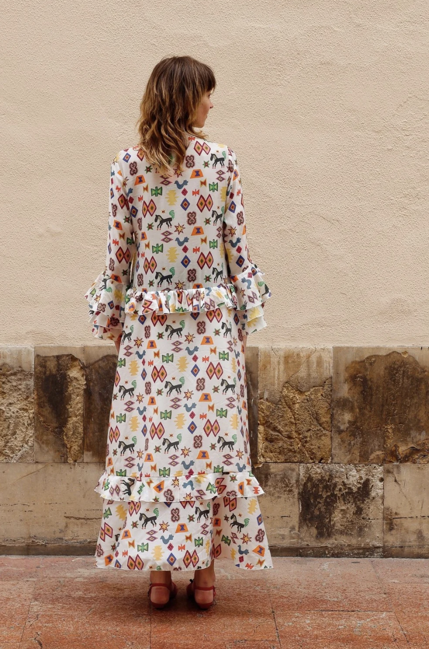 The Delight Dress is a flowing maxi dress crafted in a light floral print that radiates femininity and ease. Designed with flared sleeves, ruffled cuffs, and a belted waist, it creates a flattering silhouette with subtle movement. Its button-down front adds versatility, making it suitable for both everyday elegance and more festive occasions.