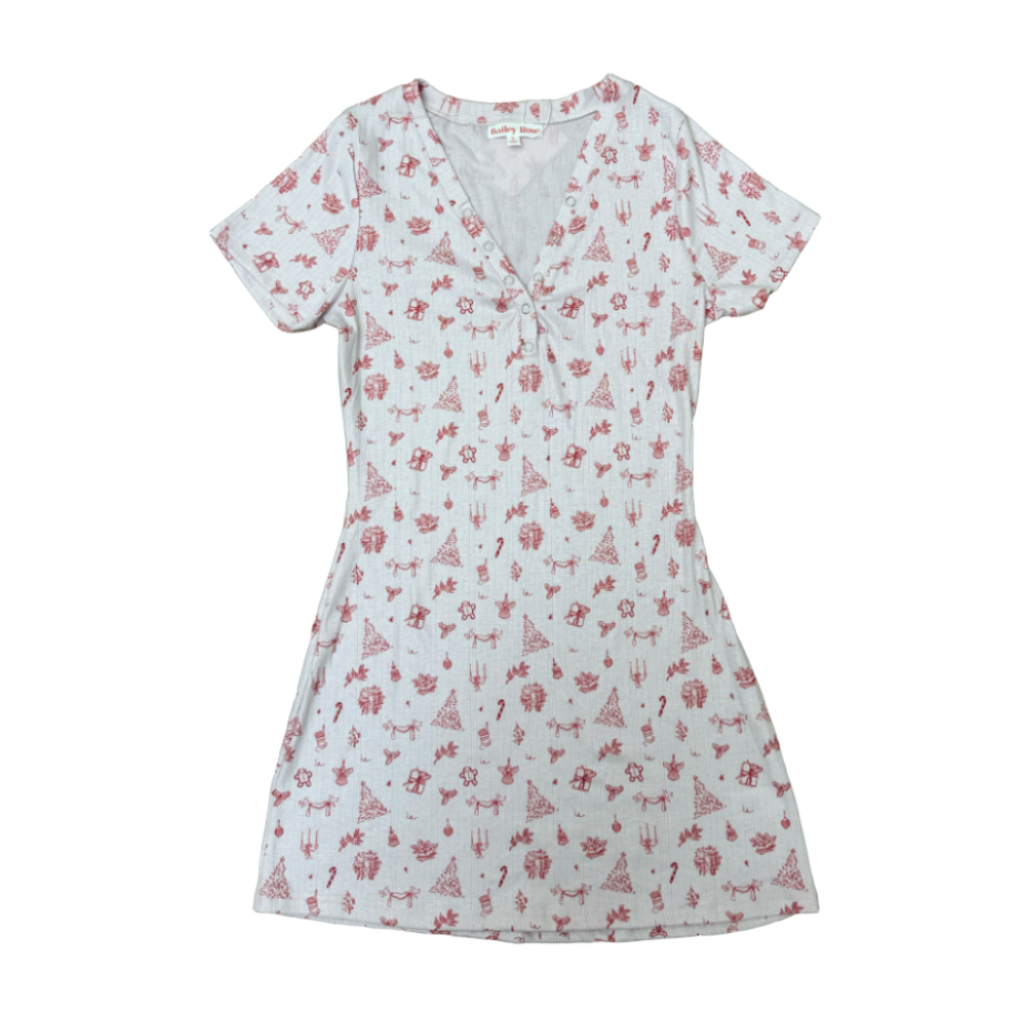 Step into cozy comfort with the Christmas Icon Lounge Dress. Made from soft cotton in pale lilac with red holiday icons.
