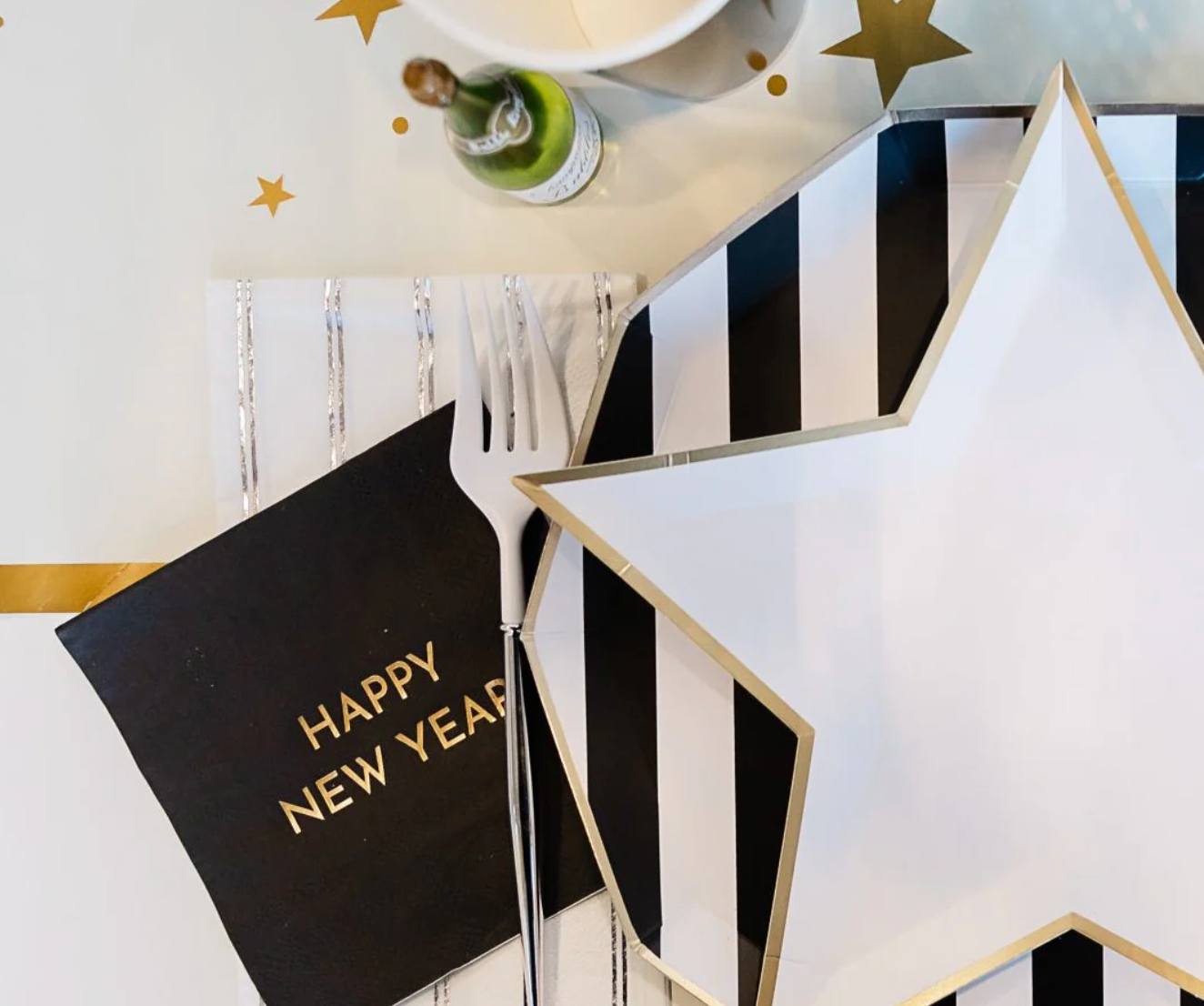 Transform your New Year's Eve celebration into a luxurious and chic affair with the dazzling addition of our black and gold foil lettered Happy New Year Cocktail Napkins! Elevate your party decor and impress your guests with this essential touch of glamour.