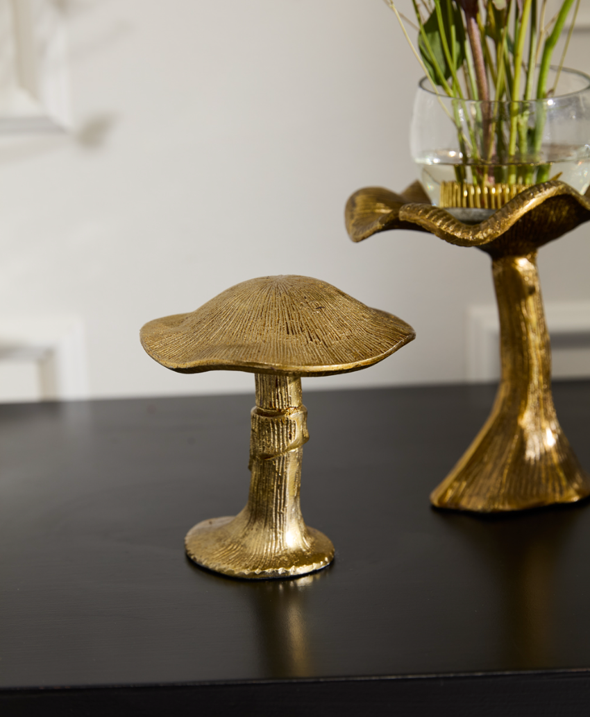 The nature inspired Lichen Figurine features an etched gold metal mushroom with a cap. This fanciful design feels like it sprang up in the forest and layers into a harvest tablescape easily.