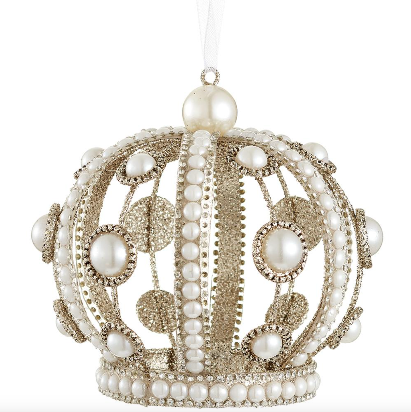 Crown your holiday tree with the Glimmer Pearl Crown Ornament, sparkling with gold glitter and accented by elegant pearl beads. This playful decoration adds a royal touch and a bit of whimsy, making your festive décor shine with charm and sparkle. Perfect for spreading cheer with a touch of sparkle and sophistication.