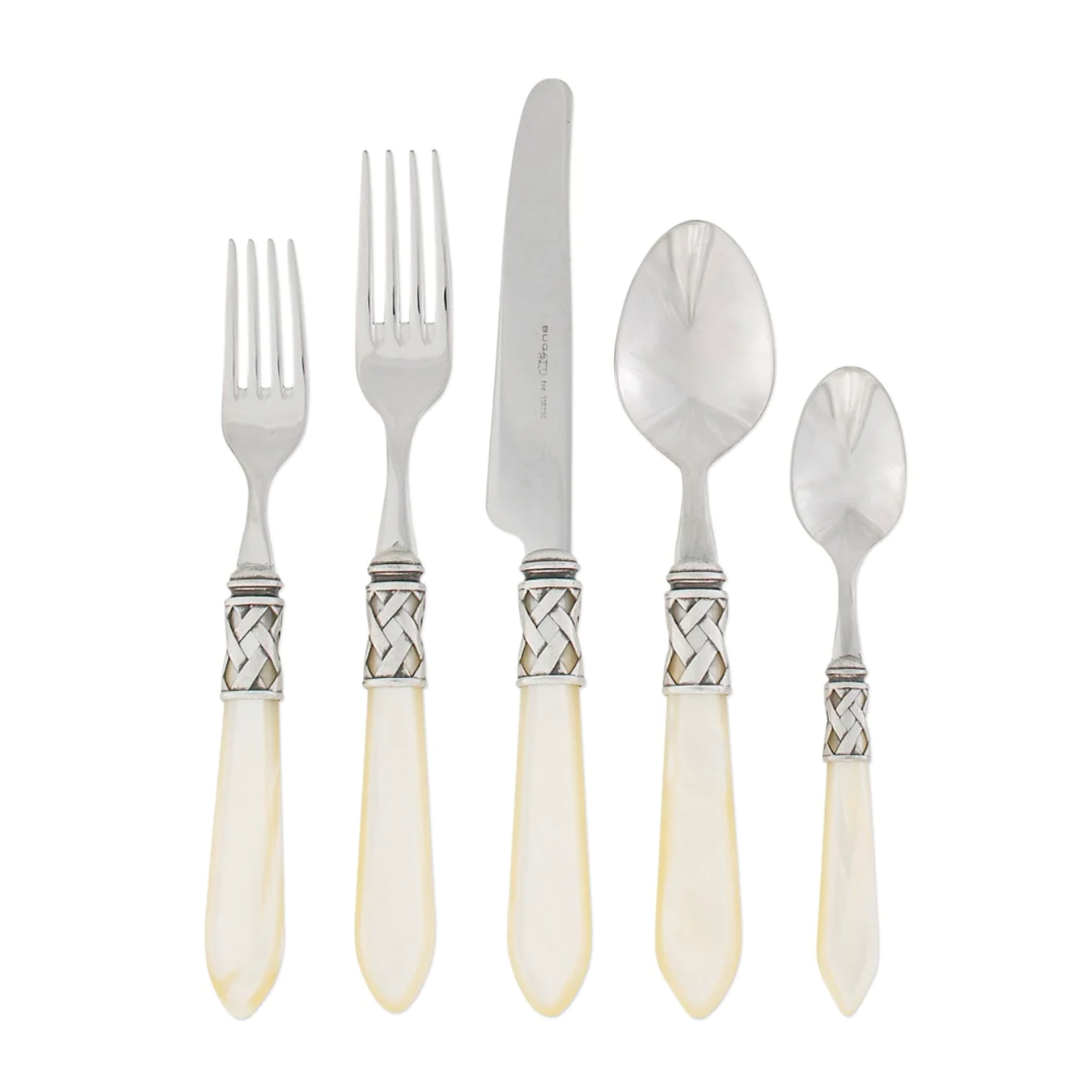 The Aladdin Antique Salad Fork features elegant pearlized handles with the strength of high-grade acrylic and 18/10 stainless steel. This piece is also available in our brilliant finish.