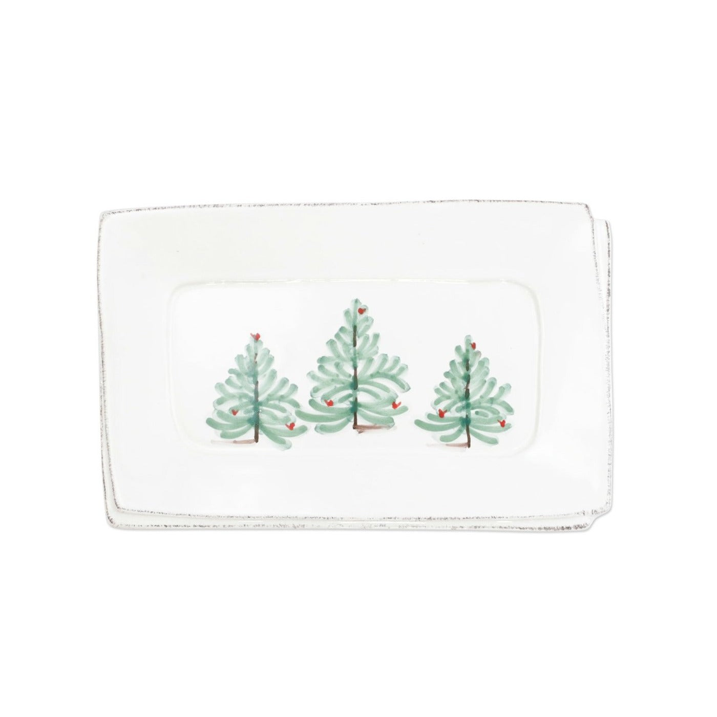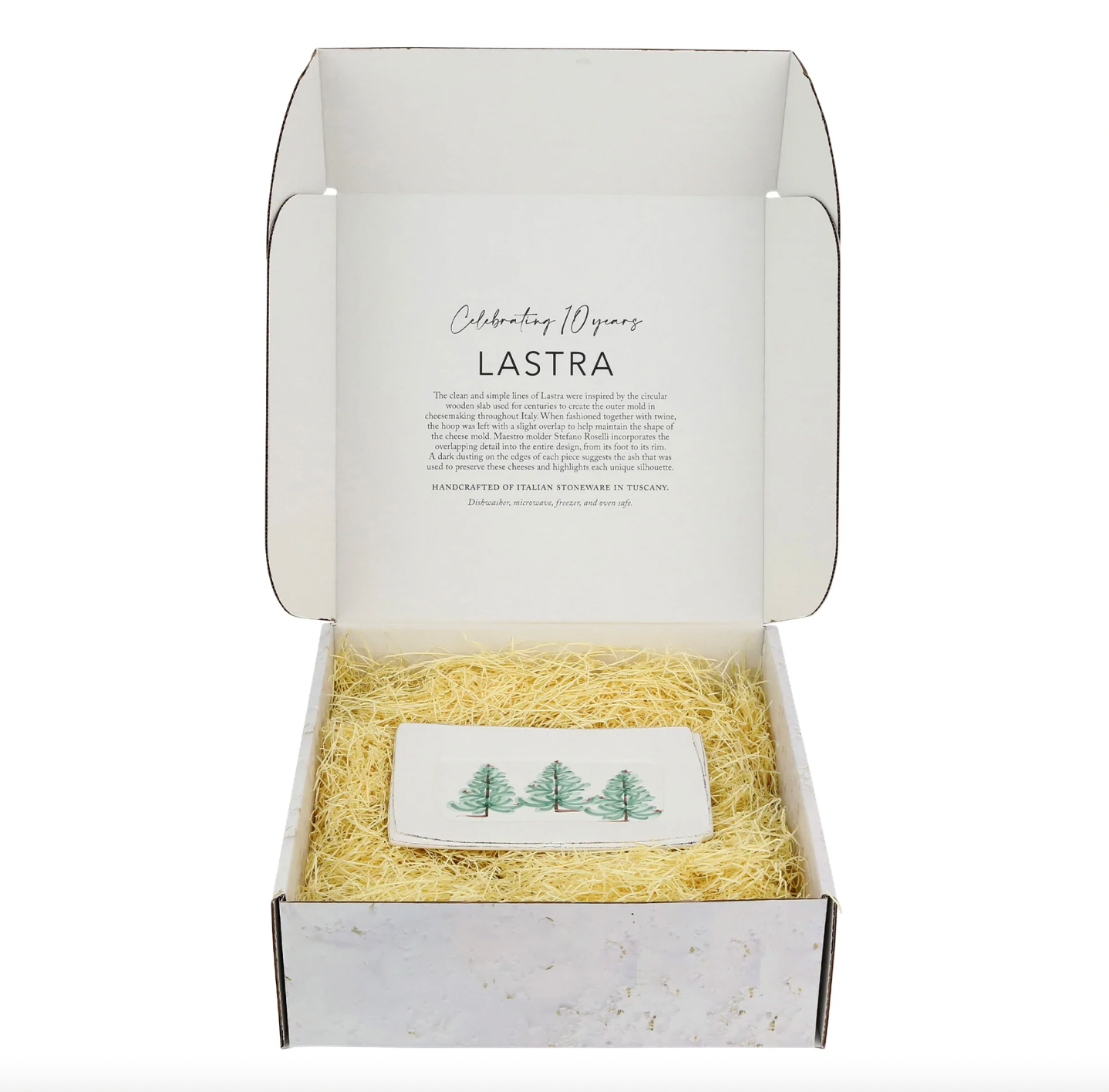 Delight in the holiday magic as handpainted fir trees and bright cardinals drift across the fresh white canvas of the Lastra Holiday Small Rectangular Tray. Mix and match with Lastra for a fun and sophisticated holiday table with a twist!