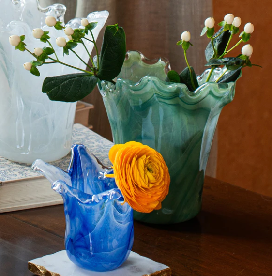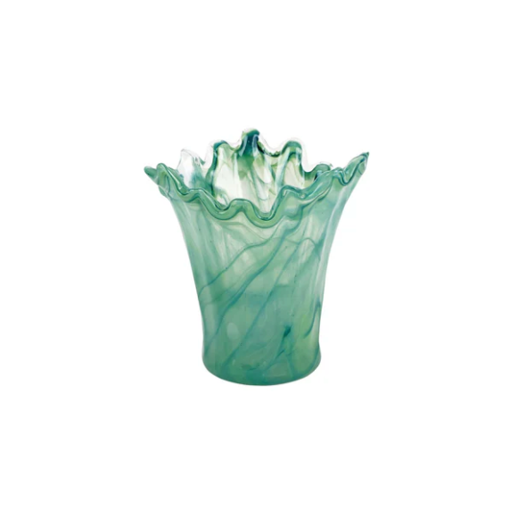 Mouthblown in Italy, the Onda Glass Short Vase is inspired by the waves that crash into the Capri coastline.