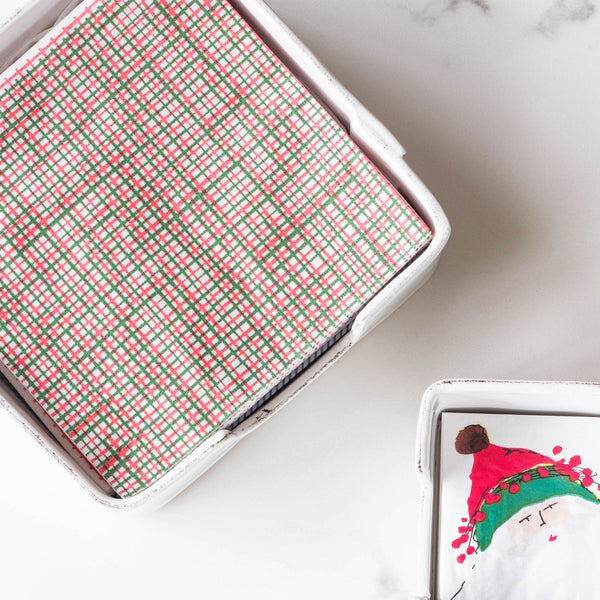 Papersoft Napkins Plaid Dinner Napkins are highly absorbent and made of a fibrous material (spunlace) in Italy. An easy grab-and-go gift for the hostess or a fun addition to your last-minute dinner party, these napkins are perfect for the holidays.