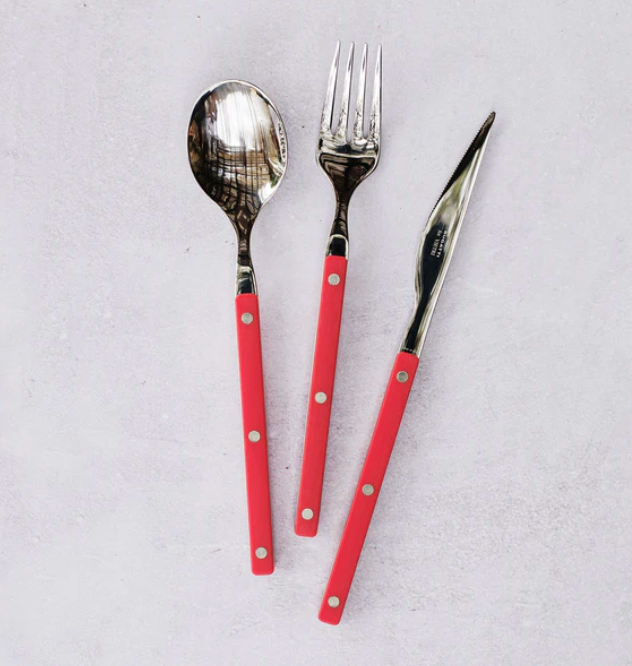 18/10 stainless steel is the ideal material for flatware due to its durability, rust and corrosion resistance, and polished finish. Comprised of 18% chromium and 10% nickel, it offers strength, long-lasting performance, and a tarnish-resistant shine. Stainless steel is not stain proof. Ingredients found in tea, coffee, salad dressing, vinegar, and salt can cause discoloration. Pitting or spotting is usually caused by hard water or foods with high salt content. ABS (Acrylonitrile Butadiene Styrene) is a durable and impact-resistant thermoplastic polymer. Its high tensile strength and resistance to abrasion make it ideal for every day flatware.