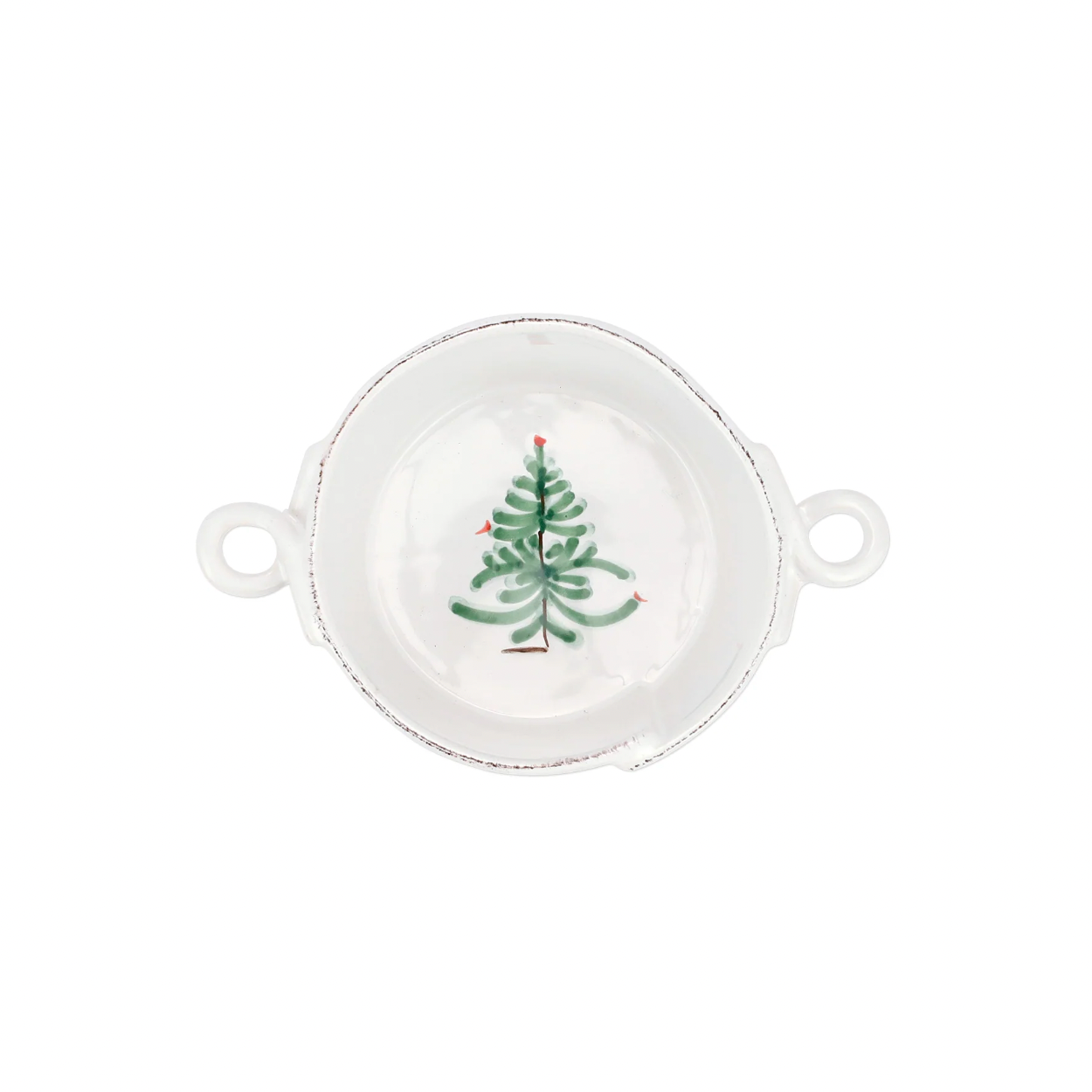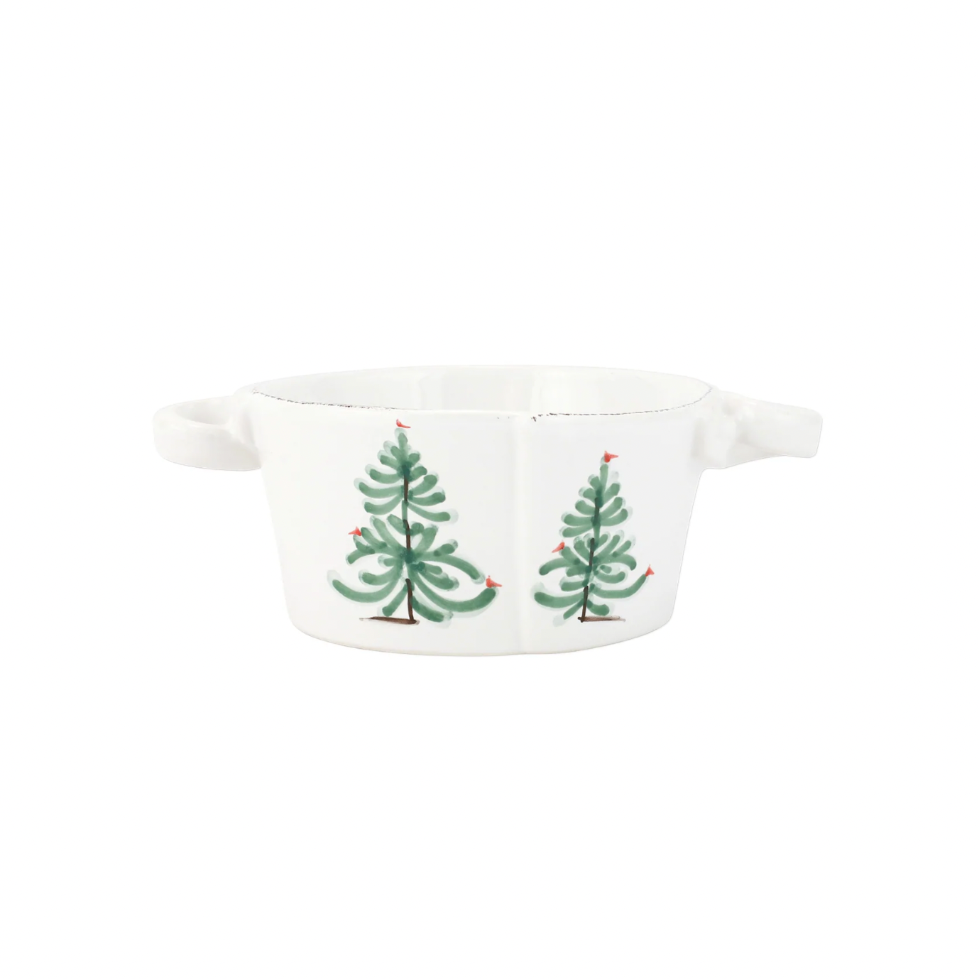 Delight in the holiday magic as handpainted fir trees and bright cardinals drift across the fresh white canvas of the Lastra Holiday Small Handled Bowl. Mix and match with Lastra for a fun and sophisticated holiday table with a twist!