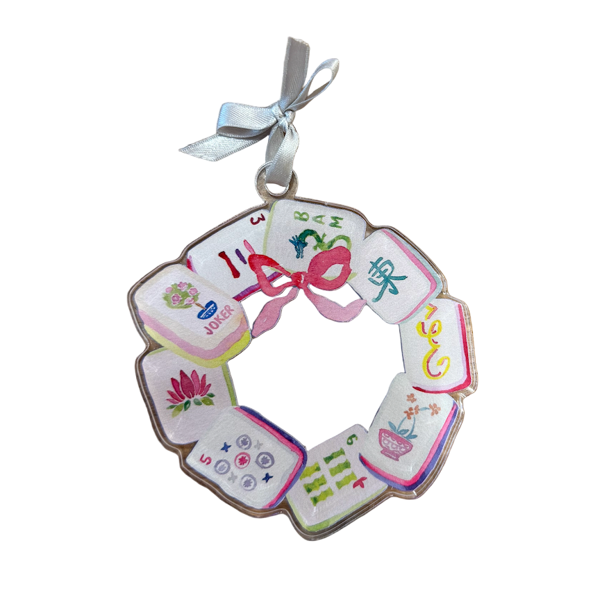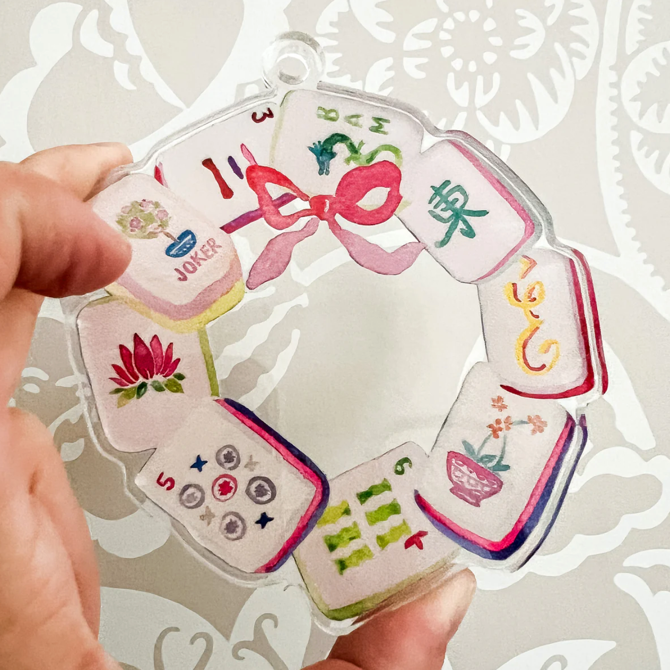 Bring timeless charm to the holidays with this unique ornament featuring a wreath design made from watercolor-painted mahjong tiles. Each tile is hand-illustrated in watercolor before being arranged into a festive circle, blending artistry and tradition. Printed on durable acrylic with a glossy finish, this ornament is lightweight yet sturdy—perfect for trimming the tree, adorning a gift, or celebrating year-round.