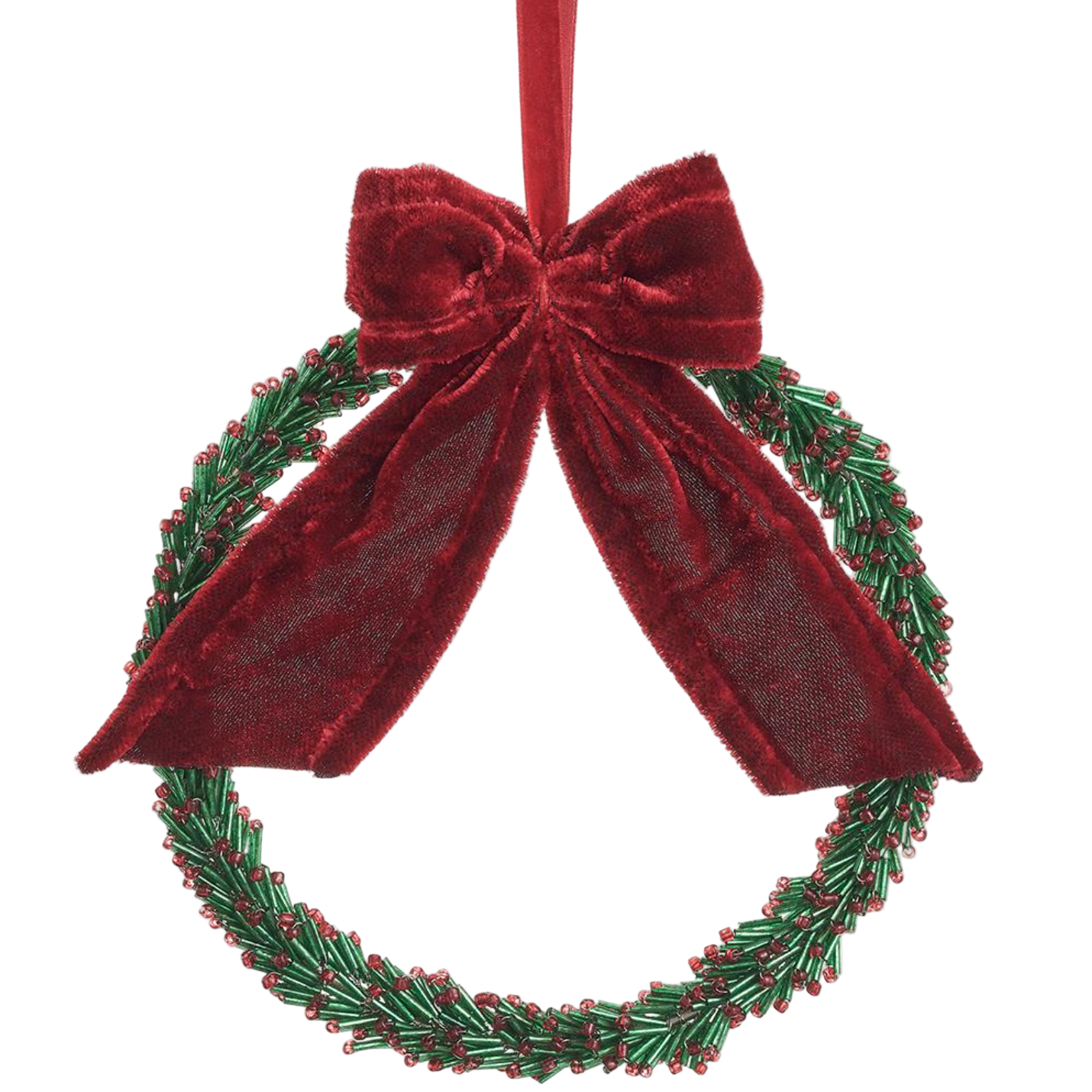 Bring a cozy, festive charm to your tree with this Beaded Wreath Ornament. Adorned with shimmering beads and finished with a soft velvet ribbon, it adds a playful touch of holiday cheer and warmth to any space.