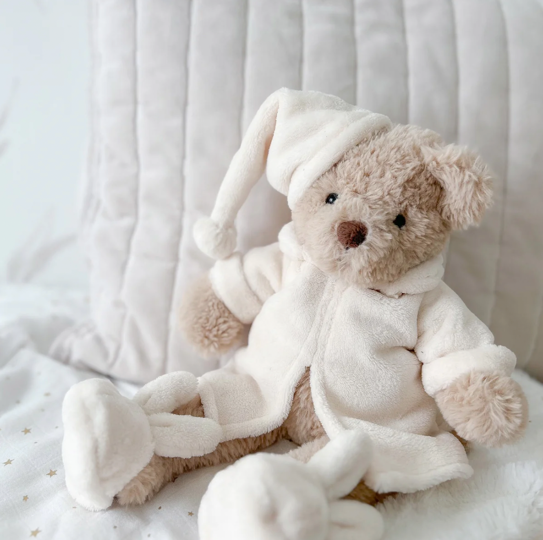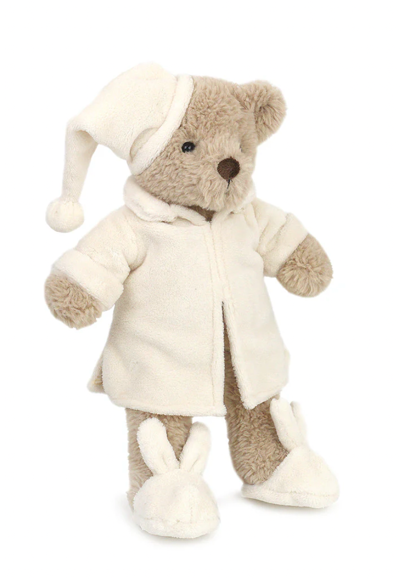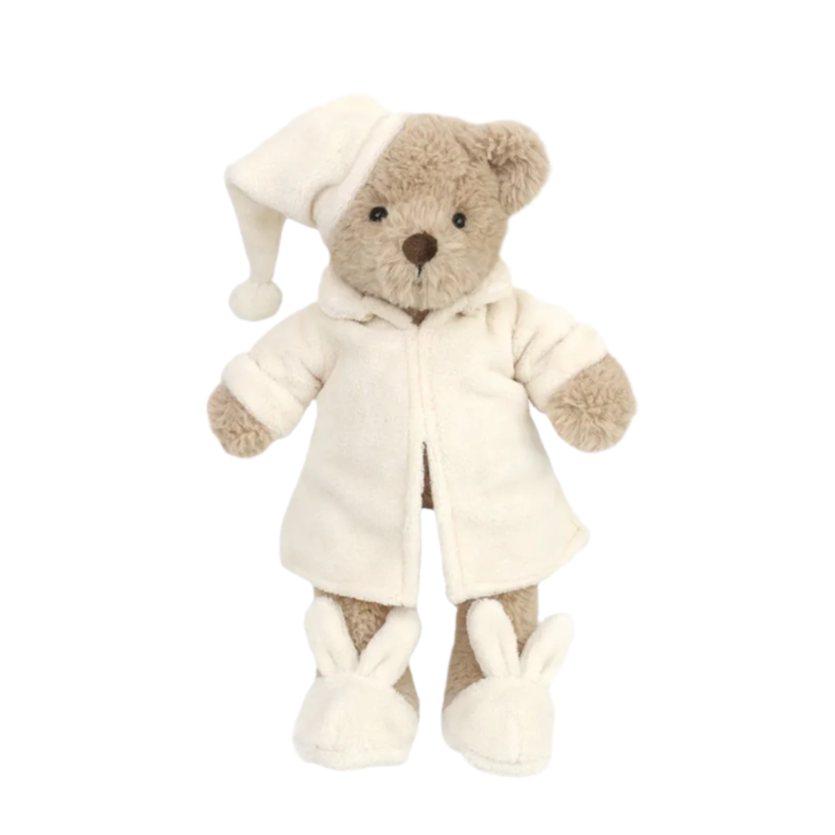 Briar Bedtime Bear, designed to be every child's perfect bedtime companion. The night cap adds a whimsical touch, while the robe ensures that Briar is always ready for a bedtime routine. But perhaps the most adorable feature of Briar Bedtime Bear is the pair of bunny plush slippers adorning its feet.