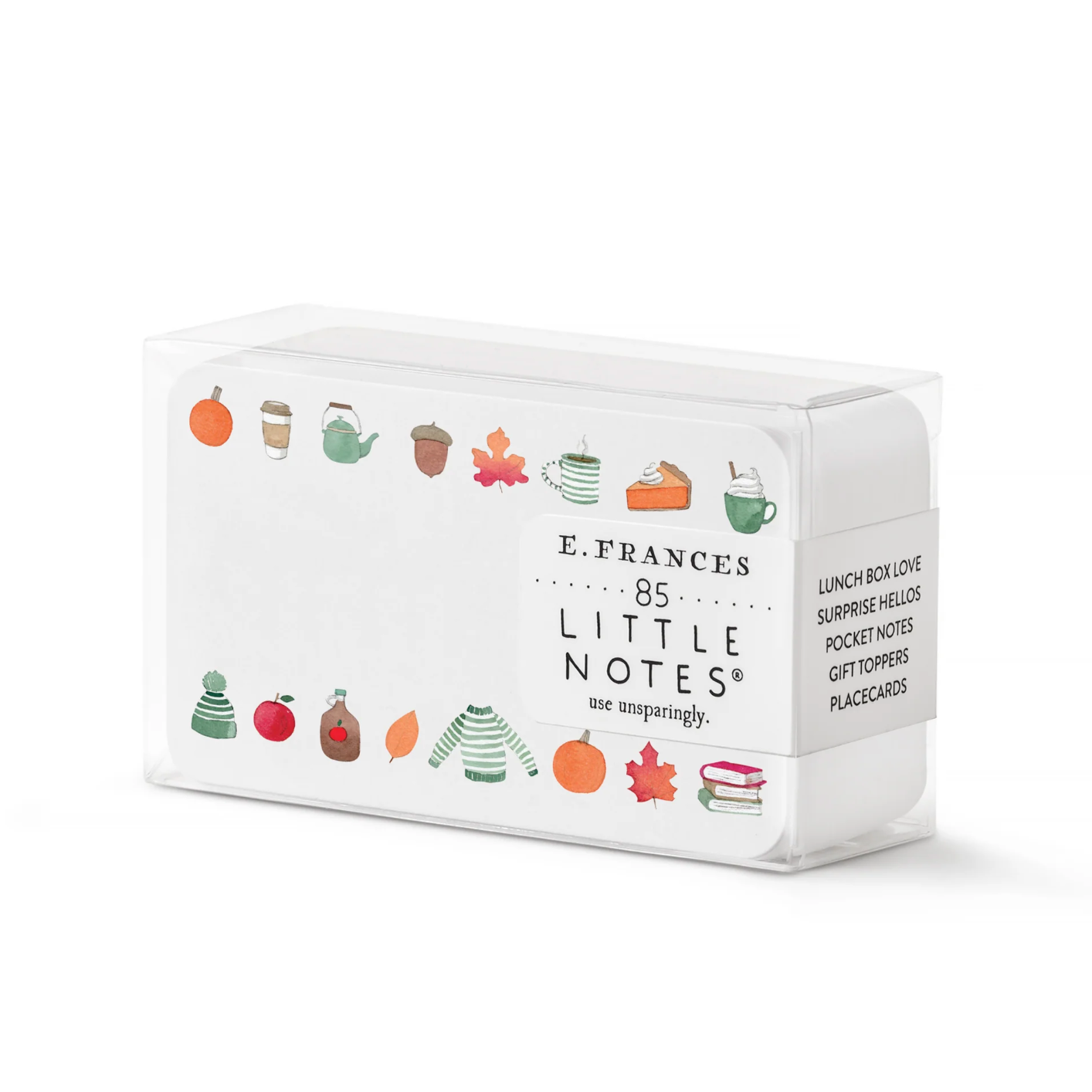 The original Little Notes® are small notecards with big charm.  These Crisp & Cozy Little Notes® unlock smiles, spread cheer, and send more love! Each Little Note has a hand painted watercolor illustration on the front and back. And yes, you read that correctly - each box contains 85 tiny notecards for you to use unsparingly! From memos and reminders to lunch box notes, place cards, and gift tags, the possibilities for these versatile cards are endless.