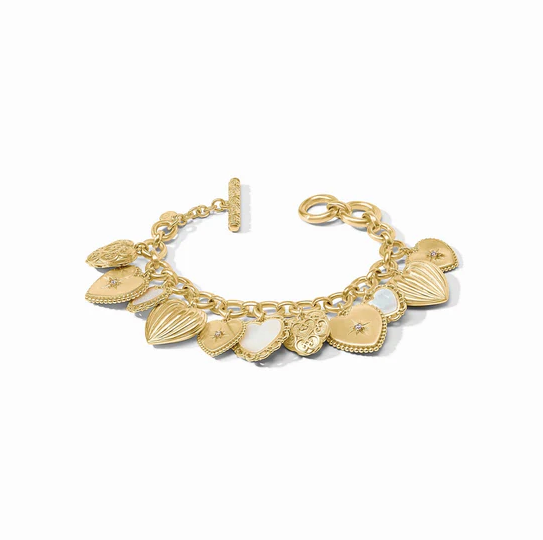 A bracelet of ornate, vintage-inspired gold heart charms, featuring sparkling gemstones, shimmering mother of pearl, and delicate latticework dangling from an airy cable chain that closes with an ornate adjustable toggle.