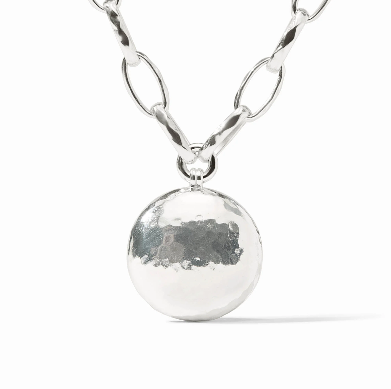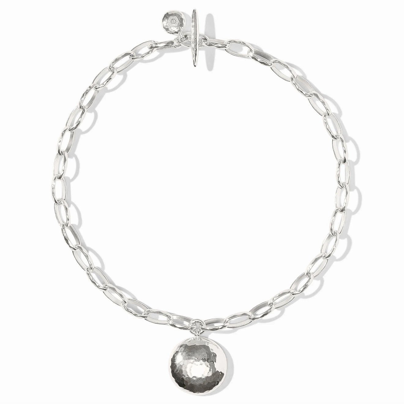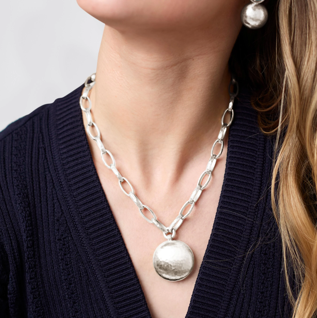 Shimmering lightly hammered oval links finished with a toggle closure and hammered silver pendant.
