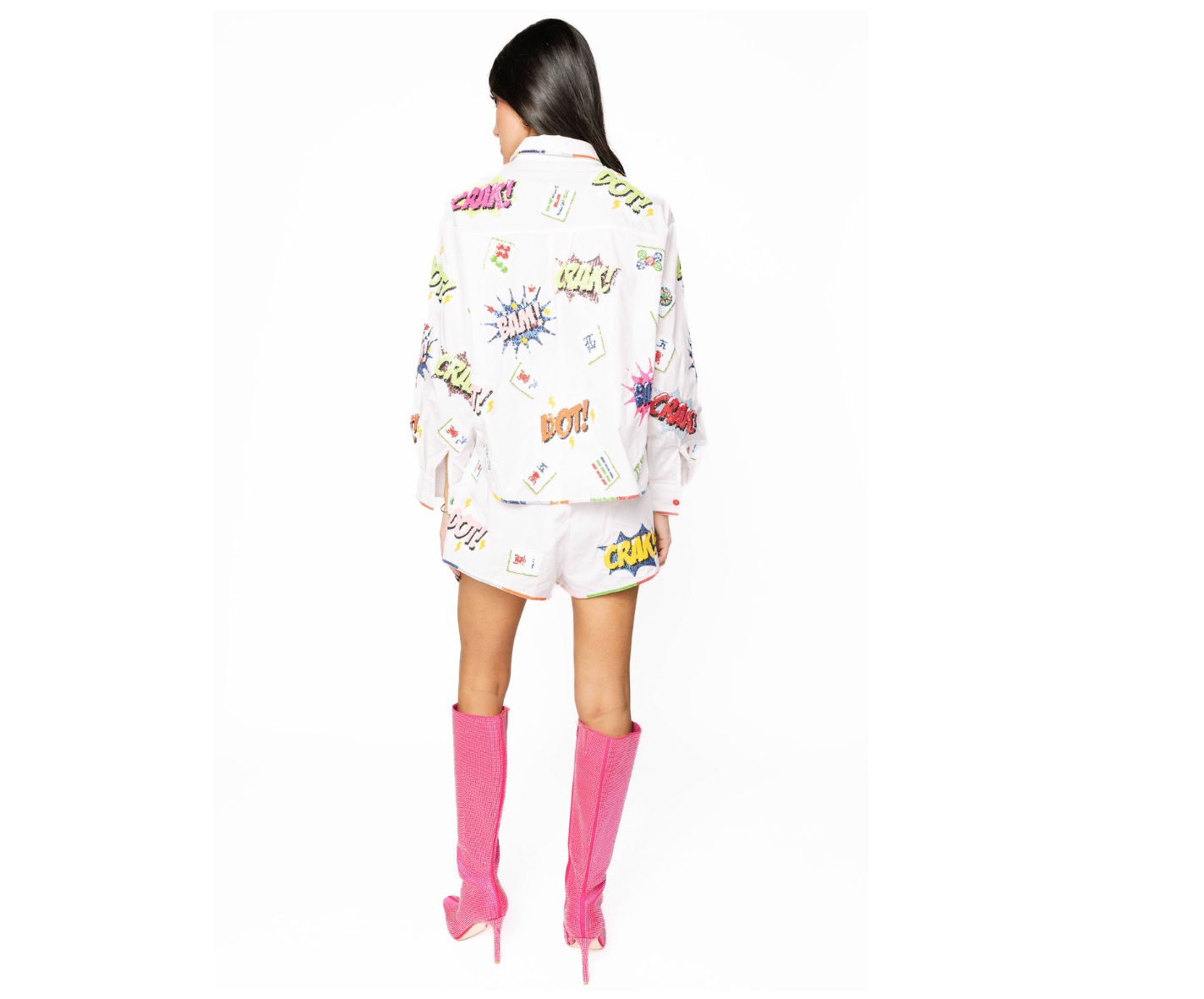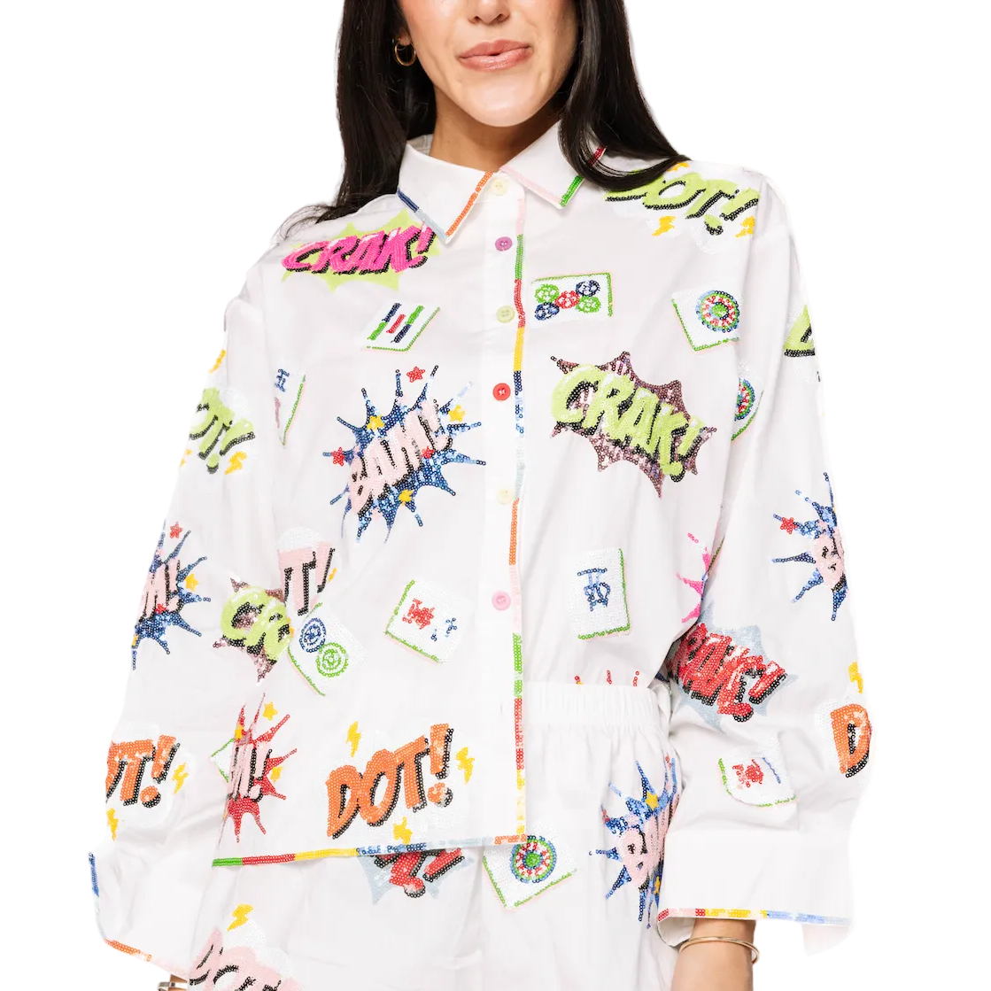Elevate your game with this playful Queen of Sparkles collared top, featuring a chic mahjong icon design that brings a touch of whimsy to your wardrobe. The crisp white base keeps things fresh and versatile, while the sparkly details add just the right amount of glamour for standing out. Perfect for game nights, casual outings, or whenever you want to channel your inner style icon. This piece proves that fashion and fun go hand in hand.