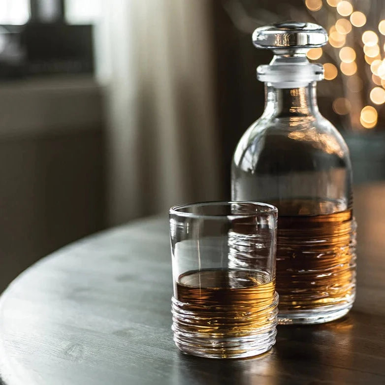 Frozen in winter, flowing in summer – our Echo Lake Collection is inspired by the constantly changing rivers, streams and waterways of Vermont. In a bold interpretation of the craft, master glassblowers nimbly wrap fine strands of glass around the bottom third of a cylindrical silhouette to form the unique, natural texture of this decanter.