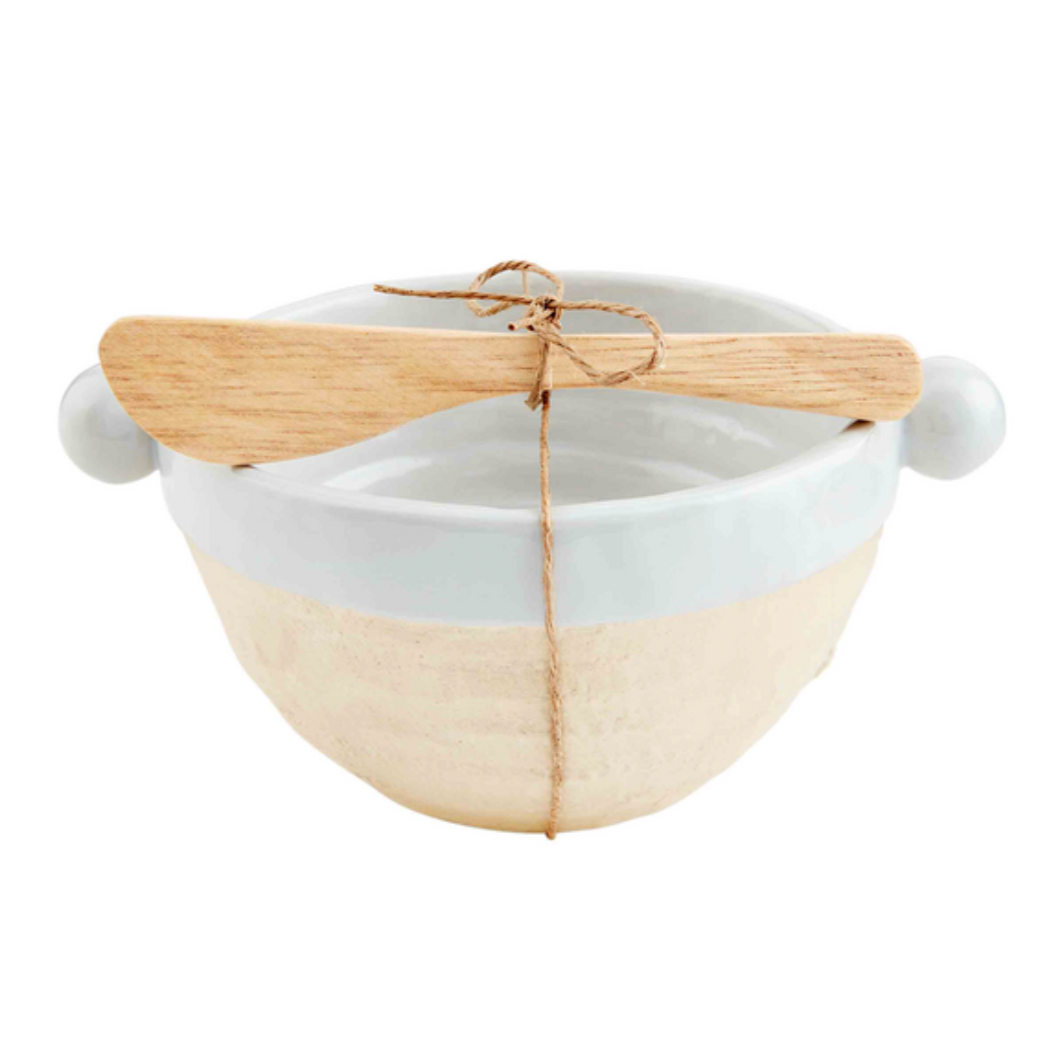 This Two Bead Bowl Set is a pretty and petite serving dish. The two set comes with a glazed and exposed stoneware bowl. The bowl features a bead rim. This beaded dip bowl comes with a coordinating wood spreader. We recommend hand washing this dip bowl after use.