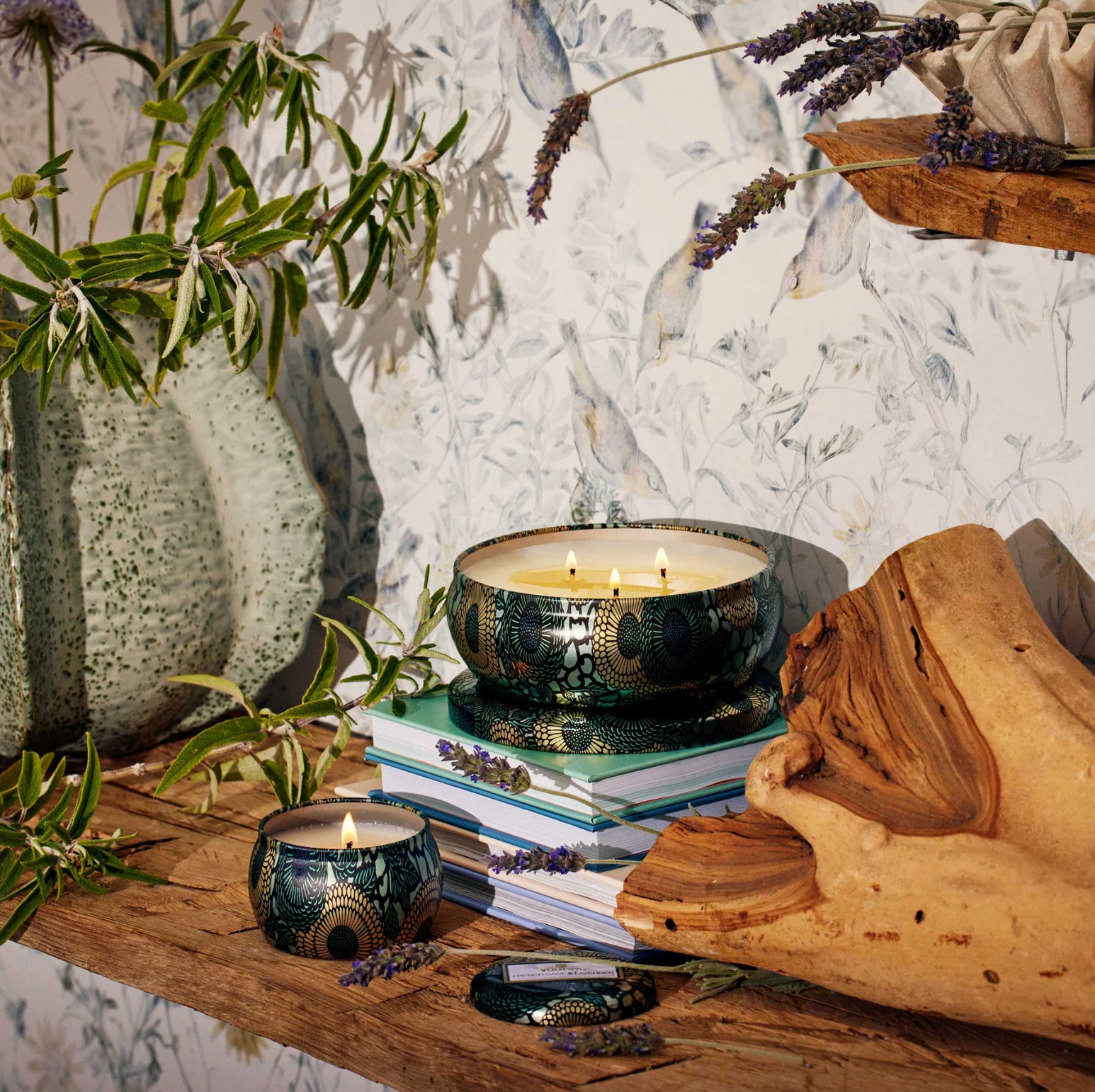 Voluspa's unique coconut wax blend is housed in a 12 oz. metal vessel adorned in Japonica pattern and topped with a matching lid that keeps the candle dust-free when not in use. Our three wicks allow you to enjoy fragrance ample fragrance throw for 40 hours. Our candles are handcrafted in the United States and feature our proprietary, clean-burning coconut wax blend and natural wicks. Our products are free of phthalates, parabens and sulfates and are never tested on animals. Up-cycle this best seller into a keepsake after the last burn.