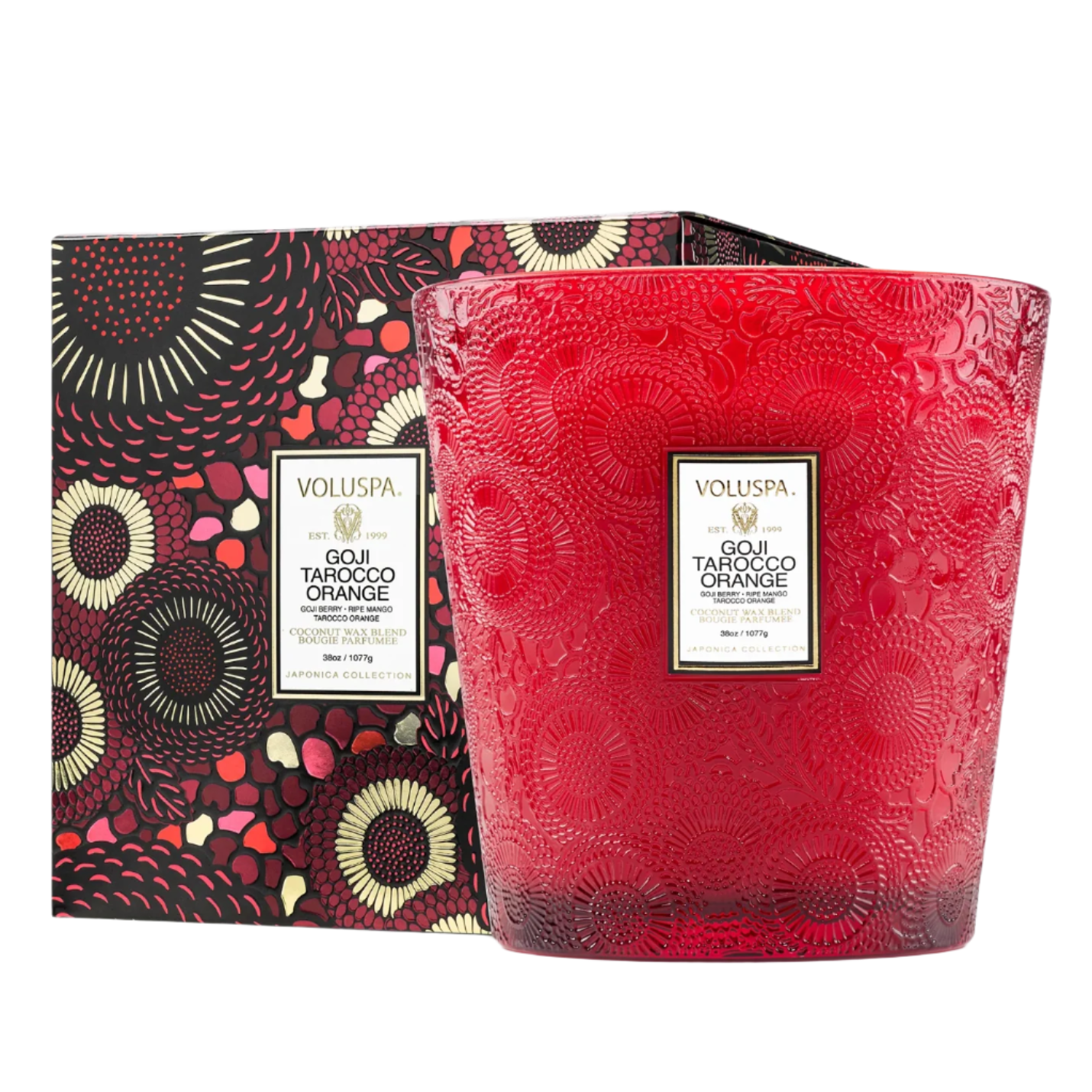 Voluspa's unique coconut wax blend is housed in a 38 oz. embossed glass jar with decorative gift box. Our three wicks allow you to enjoy fragrance throw for 80 hours. Our candles are handcrafted in the United States and feature our proprietary, clean-burning coconut wax blend and natural wicks. Our products are free of phthalates, parabens and sulfates and are never tested on animals. Up-cycle this best seller into a keepsake after the last burn.