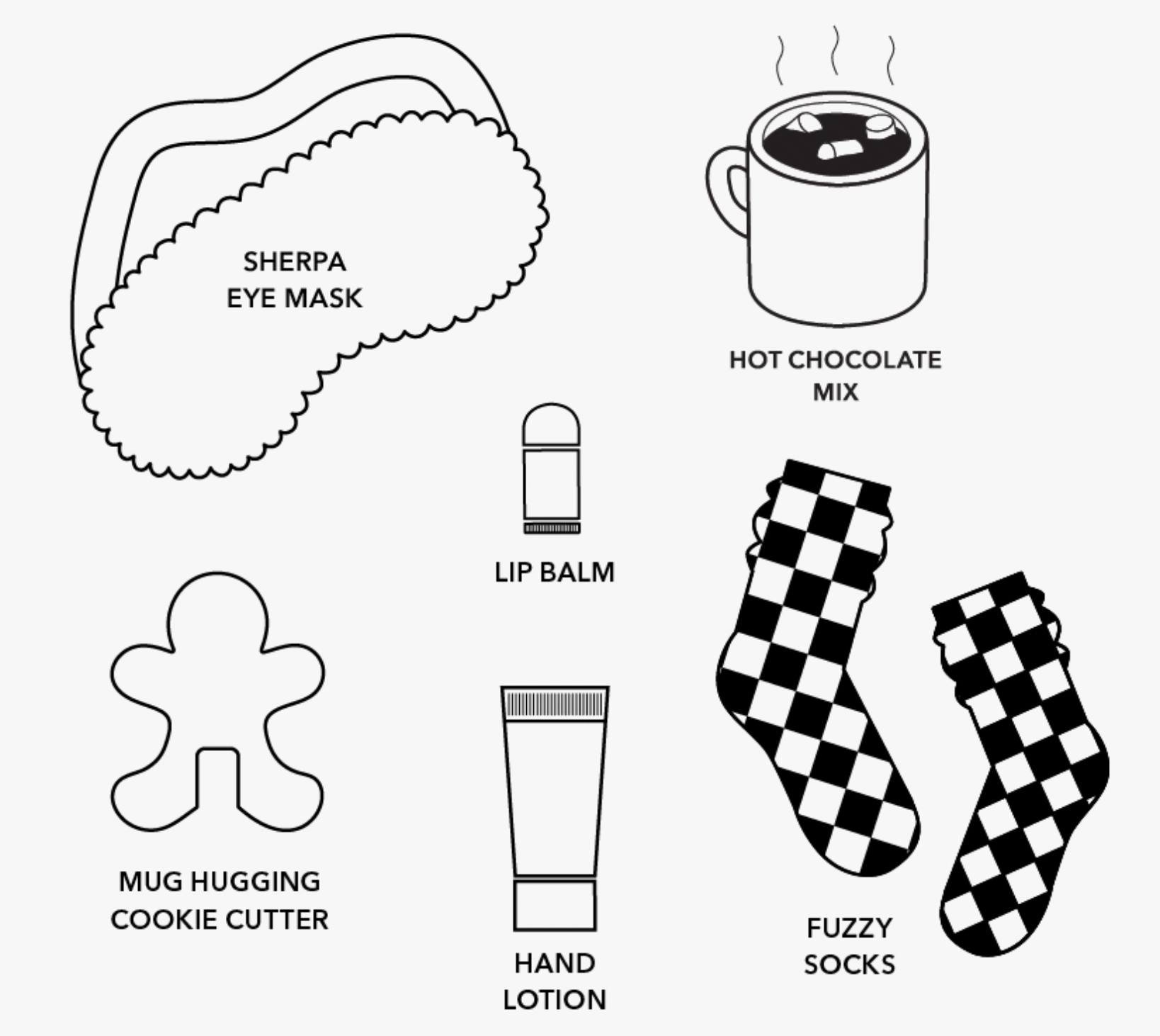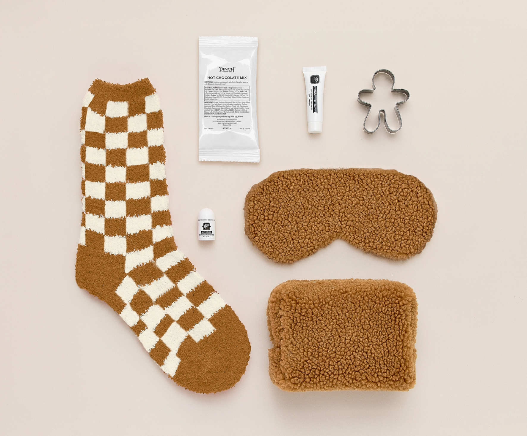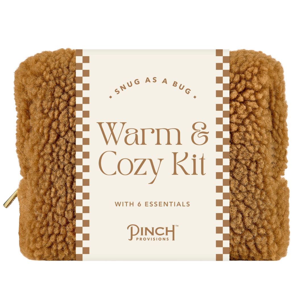 Explore the great indoors. You’ll be snug as a bug in a rug with our new Warm & Cozy Kit, packaged in a caramel sherpa zipper pouch. The kit contains 6 cozy essentials: sherpa eye mask, hand lotion, hot cocoa, gingerbread man mug hugger cookie cutter, lip balm and fuzzy socks.
