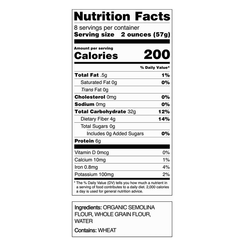 Ingredients: Organic Durum Wheat Semolina, Amber Waves Farm's Regeneratively Farmed Red Wheat, Filtered Water.